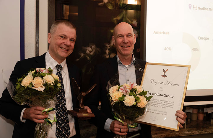 Mikael Lindholm Senior Vice President, Global Sales & Business Development (vänster), Niklas Edling CEO (höger) Med kraftlösningar som räddar liv och driver fram:dens energi - Nodica Group ger puls åt samhällskri:ska lösningar världen över. Export av svensk forskning när den är som bäst, säger Fondens ordförande Jesper Öhrn. Pressrelease Fotograf: Niklas Palmklint
